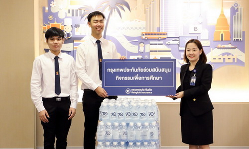 นางสาวอรวรรณ อรวัฒนานนท์ (ขวาสุด) ผู้ช่วยผู้อำนวยการ ฝ่ายทรัพยากรบุคคล เป็นผู้แทนบริษัทฯ มอบน้ำดื่มจำนวน 1,800 ขวด ให้แก่ตัวแทนนิสิตจากสโมสรนิสิตคณะแพทยศาสตร์ จุฬาลงกรณ์มหาวิทยาลัย เพื่อนำไปใช้ในกิจกรรมต่างๆ ของสโมสรฯ ณ อาคารกรุงเทพประกันภัย ถนนสาทรใต้ เมื่อวันที่ 30 พฤษภาคม 2560