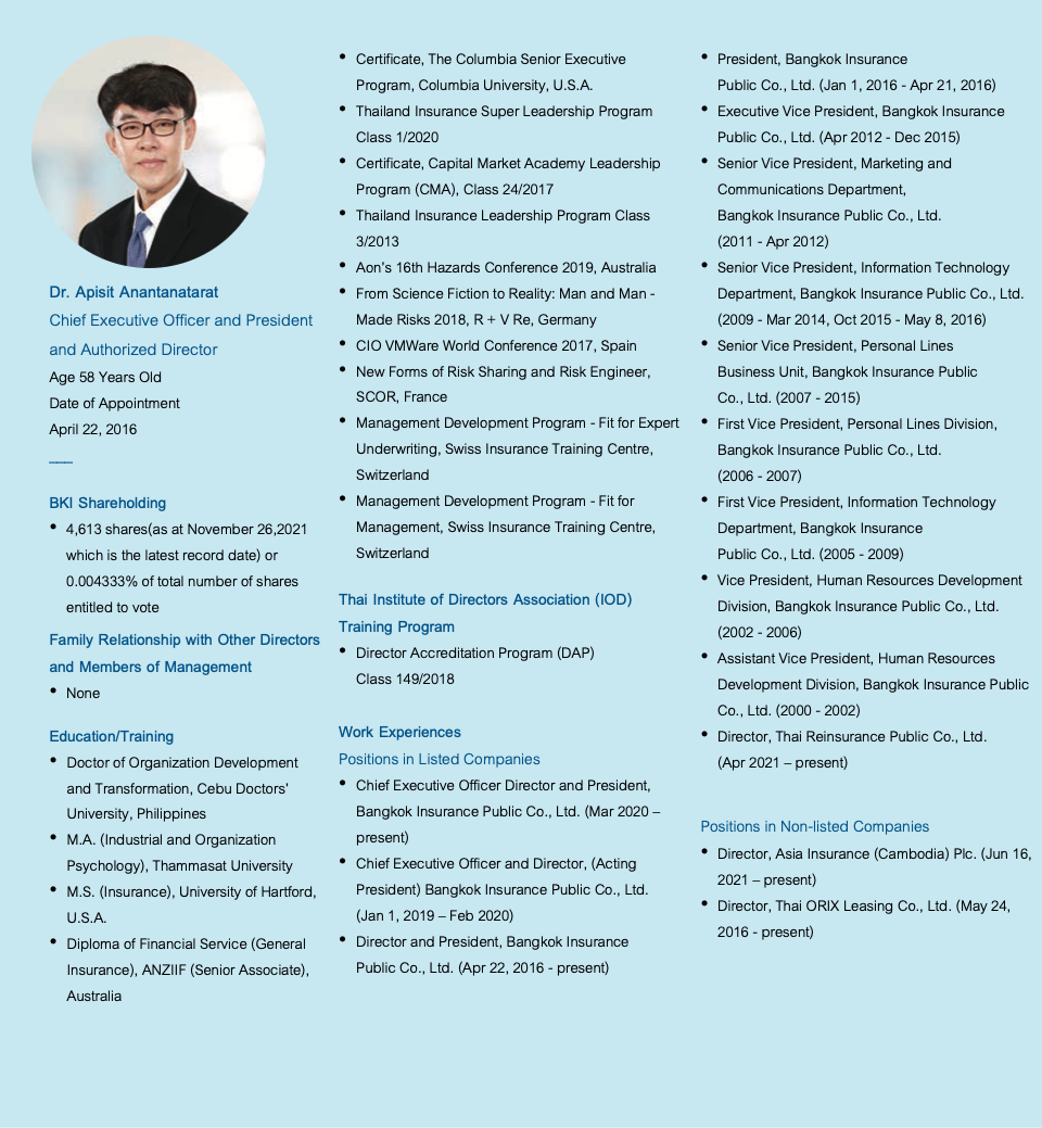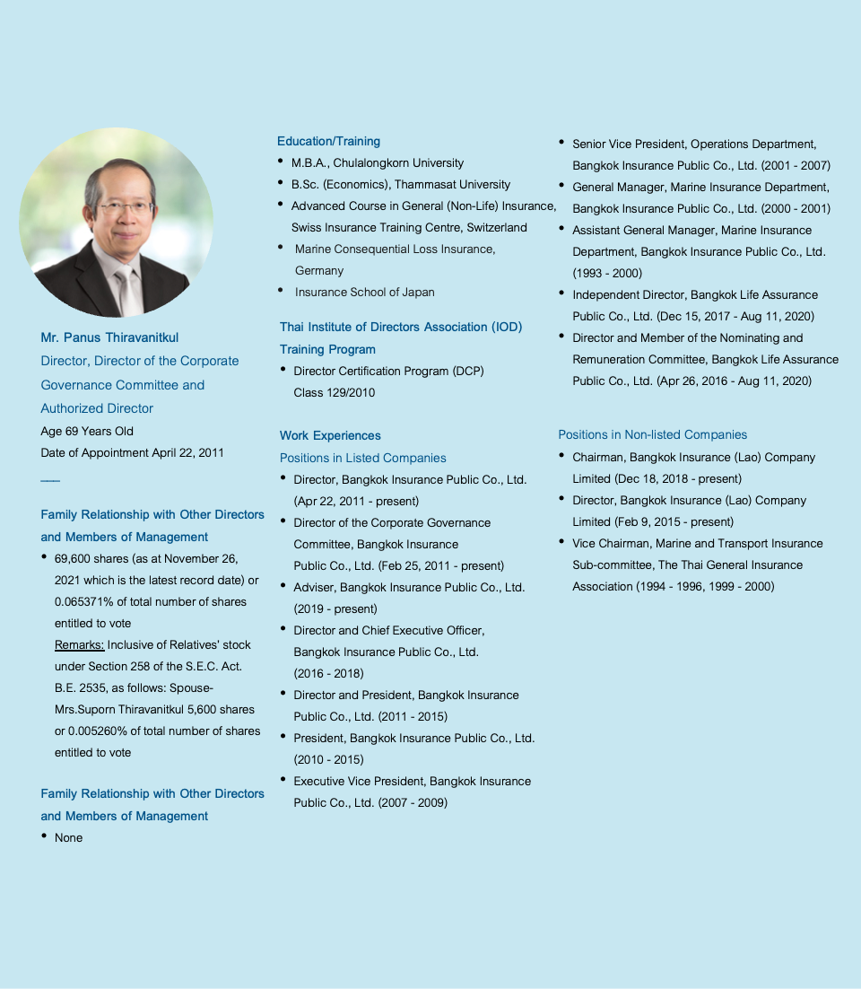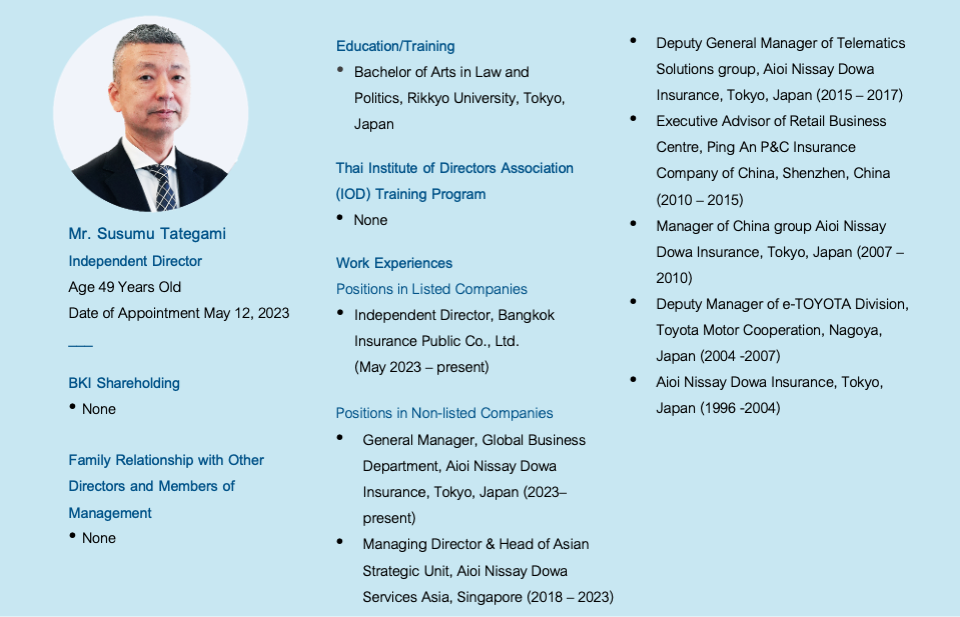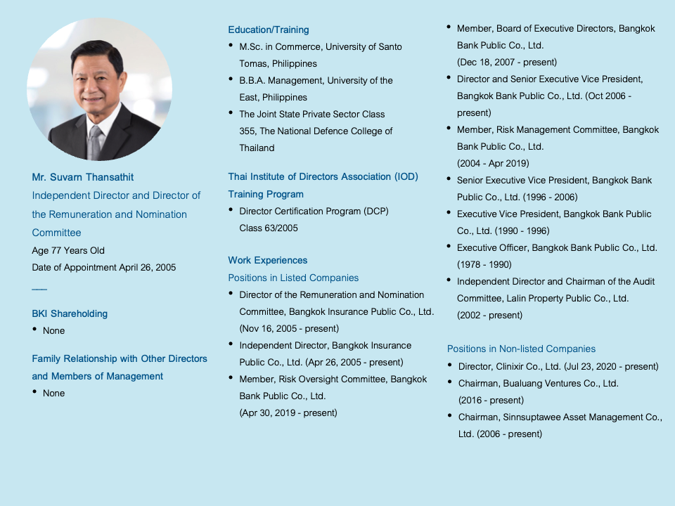 คณะกรรมการบริษัทฯ ได้มอบหมายให้คณะกรรมการกำหนดค่าตอบแทนและสรรหาทำหน้าที่สรรหาบุคคลที่มีคุณสมบัติเหมาะสมเพื่อเข้ารับการพิจารณาคัดเลือกให้ดำรงตำแหน่งกรรมการบริษัทฯ ทั้งในกรณีที่กรรมการครบวาระ ลาออก หรือกรณีอื่นๆ โดยจะพิจารณากลั่นกรองถึงคุณสมบัติ ประสบการณ์ ความรู้และความชำนาญที่หลากหลาย เช่น ความรู้เกี่ยวกับธุรกิจประกันภัย การตลาด ธุรกิจระหว่างประเทศ บัญชีและการเงิน เศรษฐศาสตร์และธนาคาร การบริหารจัดการ กฎหมายและกฎระเบียบ เทคโนโลยีสารสนเทศ เป็นต้น เพื่อให้สอดคล้องกับกลยุทธ์ในการดำเนินธุรกิจ