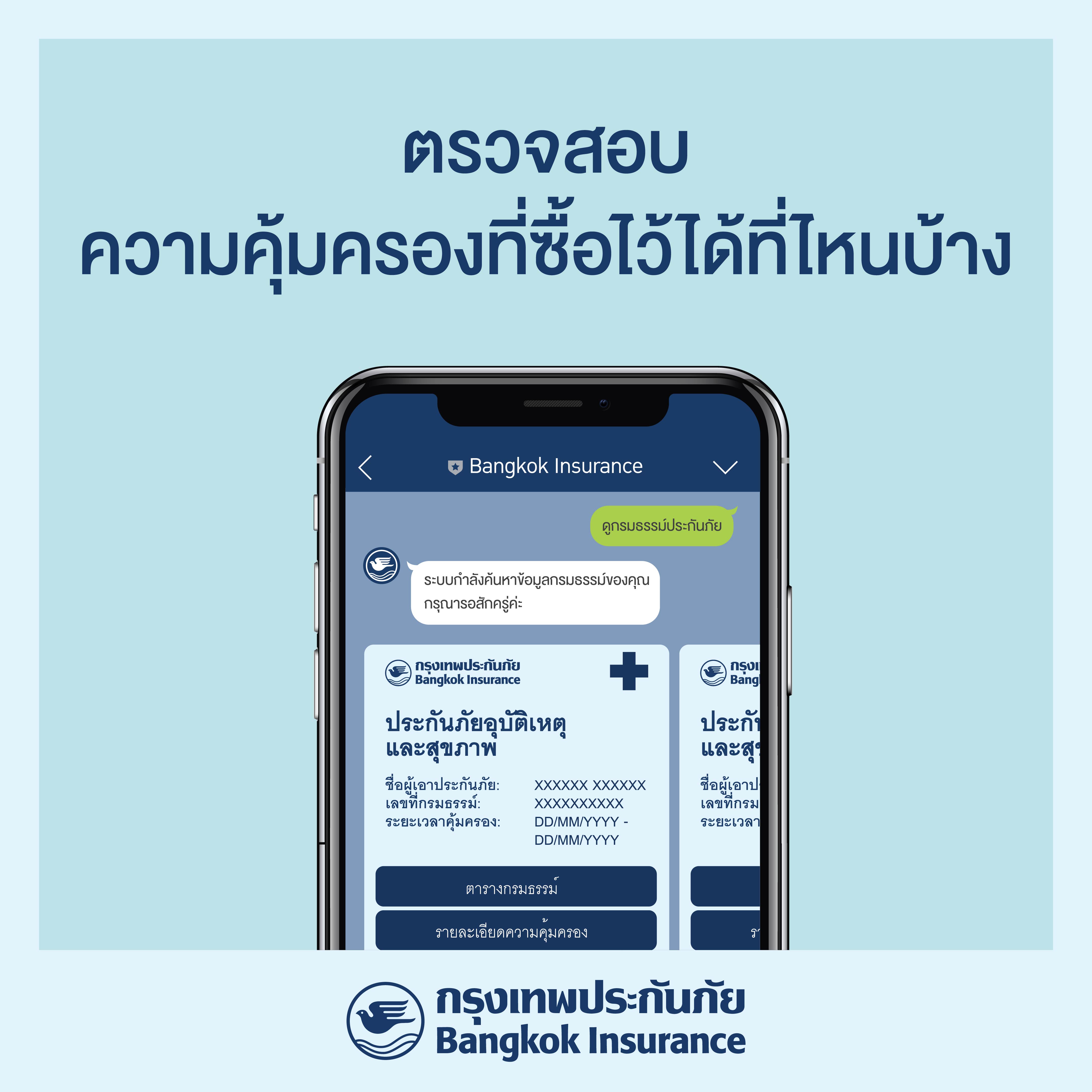 ลูกค้ากรุงเทพประกันภัยสามารถตรวจสอบความคุ้มครองหรือผลประโยชน์ต่างๆ ของกรมธรมม์ประกันภัยที่ซื้อเอาไว้ได้ง่ายๆ ด้วยตนเองผ่านช่องทางดังต่อไปนี้