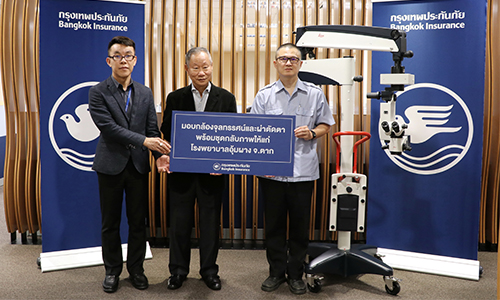 นายชัย โสภณพนิช ประธานกรรมการ (กลาง) และ ดร.อภิสิทธิ์ อนันตนาถรัตน (ซ้ายสุด) กรรมการและประธานคณะผู้บริหาร กรุงเทพประกันภัย ร่วมมอบกล้องจุลทรรศน์สำหรับผ่าตัดตาไมโครสโคป พร้อมชุดกลับภาพสำหรับผ่าจอประสาทตา รวมมูลค่า 2,500,000 บาท ให้แก่ นายแพทย์วรวิทย์ ตันติวัฒนทรัพย์ (ขวาสุด) ผู้อำนวยการ โรงพยาบาลอุ้มผาง จังหวัดตาก เพื่อใช้ในการรักษาผู้ป่วยซึ่งส่วนใหญ่เป็นชาวเขาในพื้นที่ห่างไกลที่ไม่สามารถเดินทางมารับบริการที่โรงพยาบาลในตัวจังหวัดได้ โดยกล้องจุลทรรศน์ดังกล่าวใช้สำหรับส่องดูเลนส์ตาที่เสื่อมและใช้ตอนใส่เลนส์เทียม ณ อาคารกรุงเทพประกันภัย ถนนสาทรใต้ เมื่อวันที่ 14 มกราคม 2562