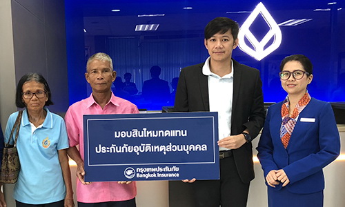 กรุงเทพประกันภัย โดยนายฐิรวัฒน์ ศรีเมืองกาญจนา (ที่ 2 จากขวา) ผู้จัดการสาขาอุบลราชธานี เป็นผู้แทนบริษัทฯ มอบสินไหมทดแทนประกันภัยอุบัติเหตุส่วนบุคคล PA 1st Smart จำนวน 420,000 บาท ให้แก่นางสอน โสริโย (ซ้ายสุด) ผู้รับประโยชน์ จากกรณีที่นายสมเกียรติ โสริโย ผู้เอาประกันภัยซึ่งเป็นบุตรเกิดอุบัติเหตุขับขี่รถจักรยานยนต์พลิกคว่ำทำให้เสียชีวิต โดยมีคุณขนิษฐา วีระทรัพย์ (ขวาสุด) ผู้จัดการธนาคารกรุงเทพ สาขาน้ำยืน ร่วมมอบสินไหมทดแทนและเป็นสักขีพยาน ณ ธนาคารกรุงเทพ สาขาน้ำยืน จังหวัดอุบลราชธานี เมื่อวันที่ 3 กรกฎาคม 2561