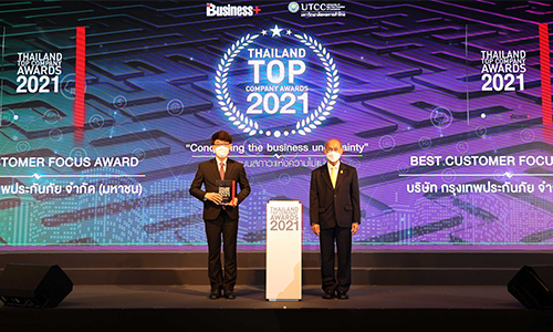 กรุงเทพประกันภัยได้รับรางวัล Best Customer Focus Award สุดยอดองค์กรธุรกิจไทยที่มุ่งเน้นความสำเร็จและความพึงพอใจสูงสุดของลูกค้าเป็นสำคัญ จากงานมอบรางวัล Thailand Top Company Awards 2021 จัดโดยนิตยสาร Business+ ร่วมกับมหาวิทยาลัยหอการค้าไทย เพื่อยกย่ององค์กรที่มีผลการดำเนินงานยอดเยี่ยมและมีความเป็นเลิศในแต่ละด้าน โดยได้รับเกียรติจากศาสตราจารย์เกียรติคุณ นายแพทย์เกษม วัฒนชัย องคมนตรี เป็นผู้มอบรางวัลให้แก่ ดร.อภิสิทธิ์ อนันตนาถรัตน ประธานคณะผู้บริหารและกรรมการผู้อำนวยการใหญ่ ซึ่งเป็นผลจากการที่กรุงเทพประกันภัยกำหนดกลยุทธ์ในการดำเนินธุรกิจที่ให้ความสำคัญกับลูกค้าเป็นศูนย์กลาง ด้วยความมุ่งมั่นพัฒนาผลิตภัณฑ์และการบริการประกันภัย รวมถึงช่องทางการจัดจำหน่ายให้เข้าถึงและตอบโจทย์ทุกความต้องการของลูกค้าเพื่อให้ได้รับการบริการที่มีประสิทธิภาพและได้รับประสบการณ์ที่ดี ส่งผลให้เกิดความเชื่อถือและไว้วางใจจากลูกค้ามาตลอดระยะเวลากว่า 74 ปี ซึ่งบริษัทฯ ยังคงมุ่งมั่นให้ความสำคัญต่อการพัฒนาทุกๆ ด้านอย่างต่อเนื่อง เพื่อให้ลูกค้าได้รับความพึงพอใจสูงสุด ณ ห้องบอลรูม โรงแรมอินเตอร์คอนติเนนตัล กรุงเทพฯ เมื่อวันที่ 18 พฤศจิกายน 2564
