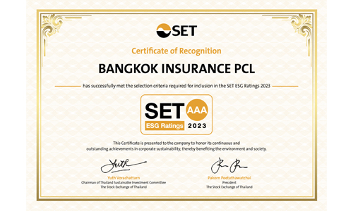 กรุงเทพประกันภัยได้รับการคัดเลือกจากผลการประเมินในรายชื่อหุ้นยั่งยืนของตลาดหลักทรัพย์แห่งประเทศไทย (SET ESG Ratings) ประจำปี 2566 ในระดับ AAA ซึ่งเป็นระดับสูงสุด โดยกรุงเทพประกันภัยเป็นหนึ่งในจำนวน 34 บริษัทจาก 193 บริษัทจดทะเบียนได้รับการคัดเลือกรายชื่อหุ้นยั่งยืนประจำปี 2566 สะท้อนให้เห็นว่ากรุงเทพประกันภัยมีความโดดเด่นด้านการมุ่งมั่นพัฒนาดำเนินธุรกิจให้เติบโตอย่างยั่งยืนและต่อเนื่อง โดยคำนึงถึงการบริหารงานตามหลักบรรษัทภิบาลที่ดี รวมถึงการบริหารจัดการที่ให้ความสำคัญต่อผลกระทบด้านสิ่งแวดล้อม และมีความรับผิดชอบต่อชุมชนสังคม ตลอดจนผู้มีส่วนได้เสียทุกกลุ่มเป็นอย่างดี (Environmental, Social and Governance หรือ ESG) อีกทั้งมีแนวทางการดำเนินงานและการบริหารจัดการประเด็นต่างๆ ในอนาคตที่ชัดเจน พร้อมรองรับความเสี่ยงใหม่ๆ ที่อาจเกิดขึ้น นอกจากนี้ บริษัทฯ ยังแสดงให้เห็นถึงขีดความสามารถทางการแข่งขันและการสร้างโอกาสทางธุรกิจ โดยให้ความสำคัญกับการดูแล ใส่ใจ และมีความรับผิดชอบต่อลูกค้า คู่ค้า พนักงาน และผู้มีส่วนได้เสียทุกกลุ่ม เพื่อให้บรรลุเป้าหมายการพัฒนาที่ยั่งยืน